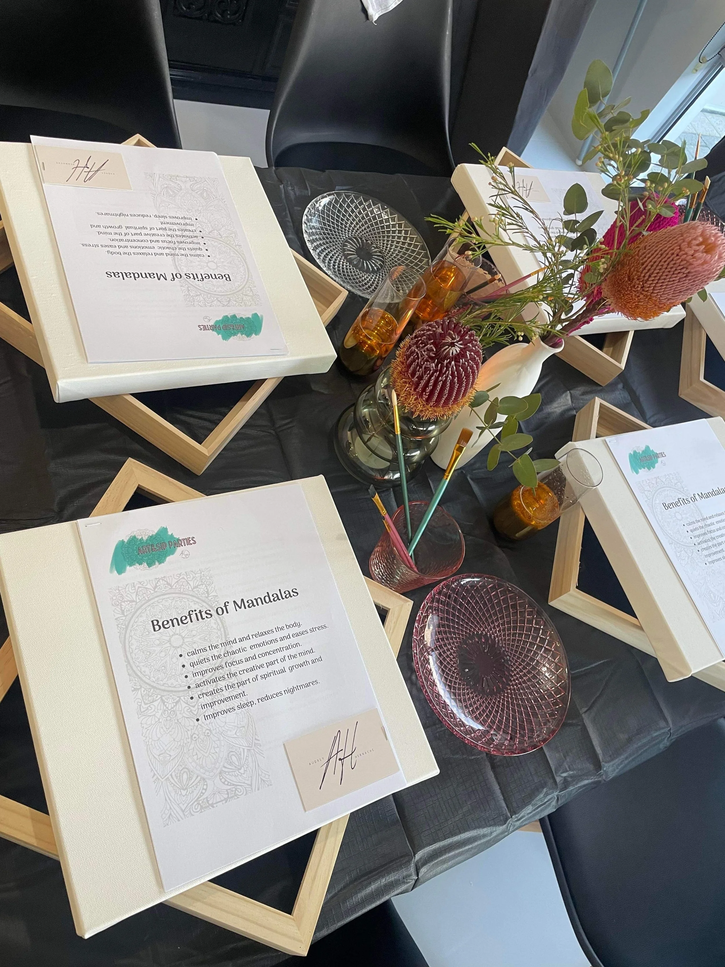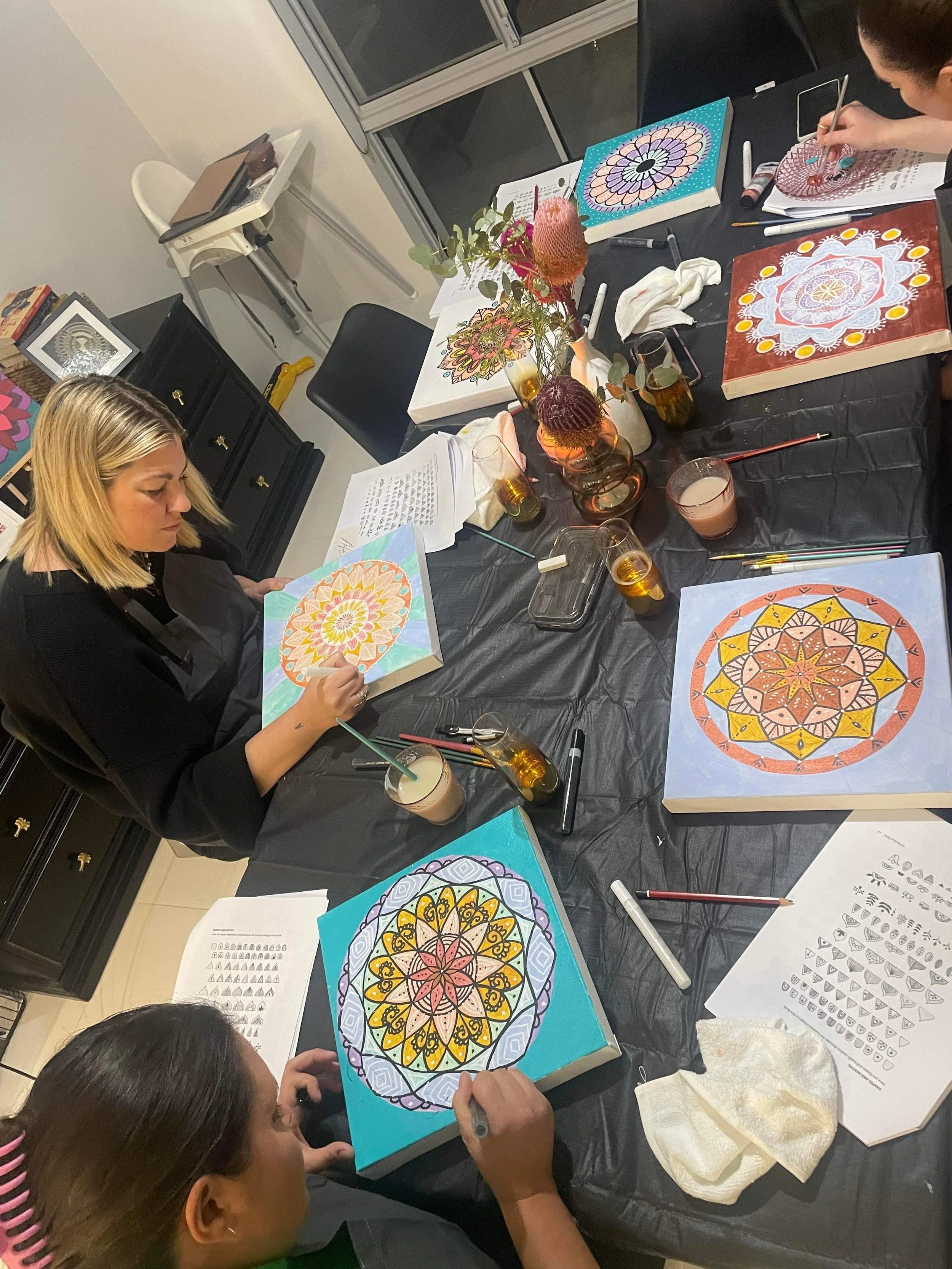 Drawing and Acrylic painting parties. These workshops are a gently guided process to create your very own individual mandala artwork. Drawing includes a frame for your finished design. Acrylic painting includes a deep canvas (framed $5 extra per person).